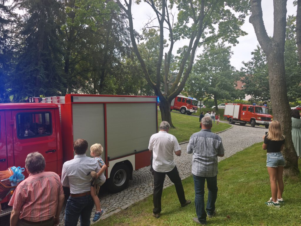 In und vor der Aula warteten alle Verwandten der neuen 1. Klässler sowie das Team der Grundschule Niederschöna mit Ihrer Schulleitung Frau Pajung. Mit lauten Sirenen fuhren die vielen Feuerwehren auf das Gelände der Oberschule. Dieser Gänsehautmoment wird noch lange in Erinnerung bleiben.