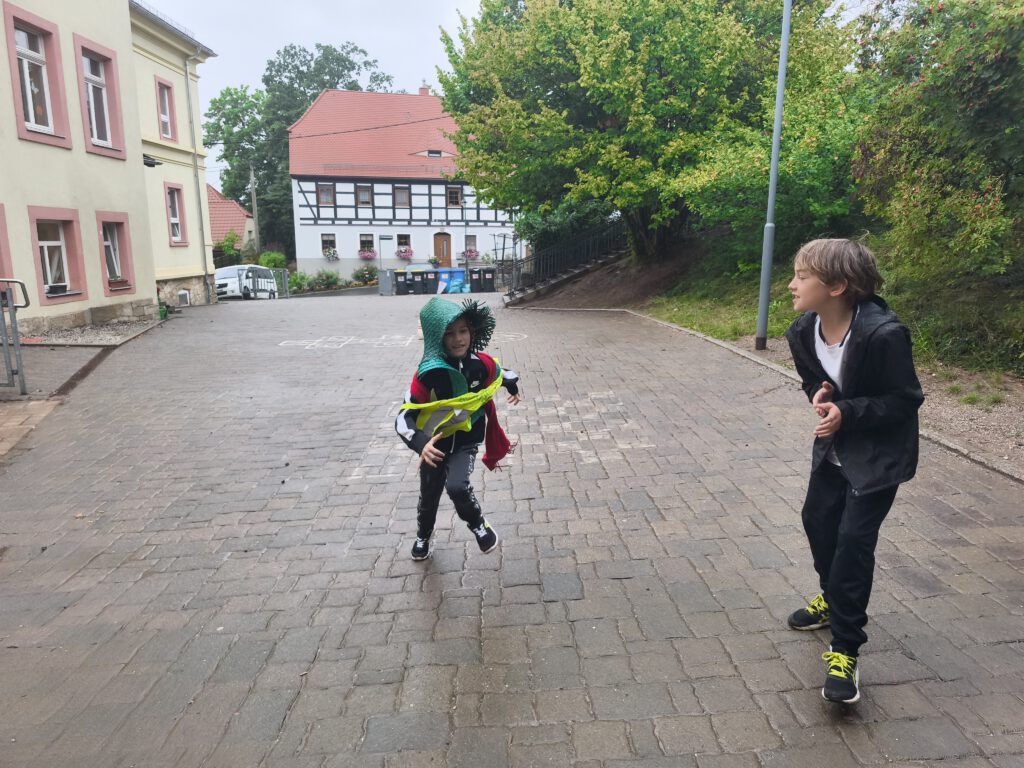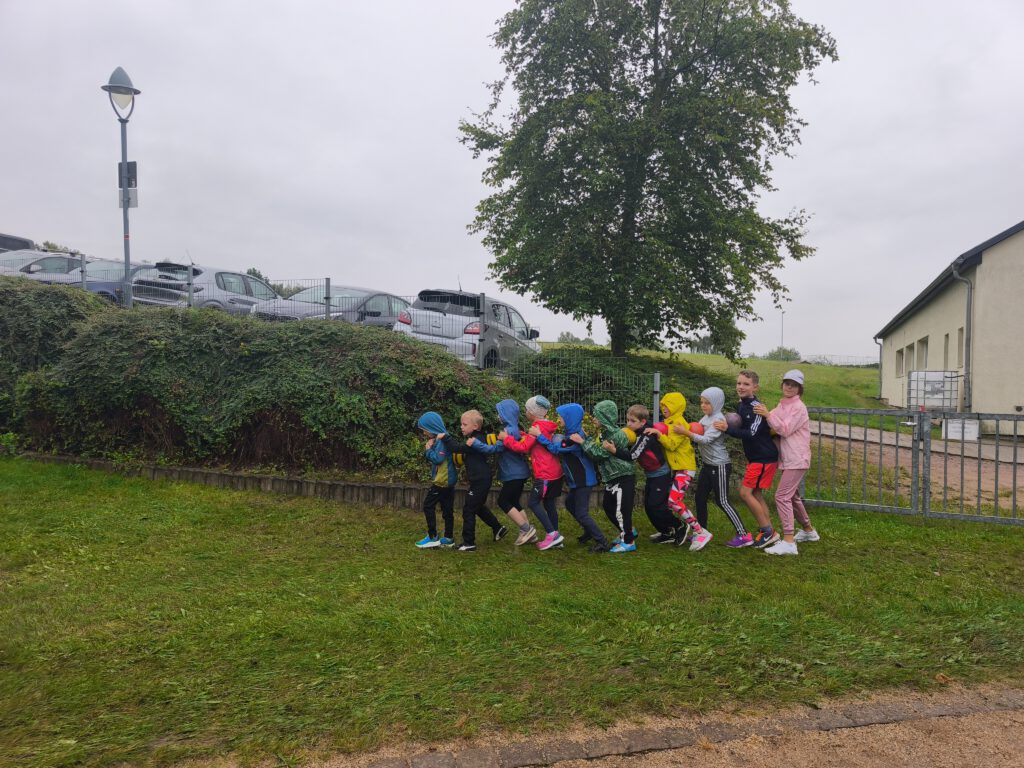 Gemeinsam folgten die Kinder den Hinweisen und meisterten Aufgaben, die nicht nur ihren Teamgeist zeigten, sondern auch, wie viel alle im ersten Schuljahr schon gelernt hatten. Jede Station war mit Erinnerungen an gemeinsame Erlebnisse verknüpft. So ging es über den Schulhof, zur Kirche in Niederschöna und auch am Insektenhotel vorbei.